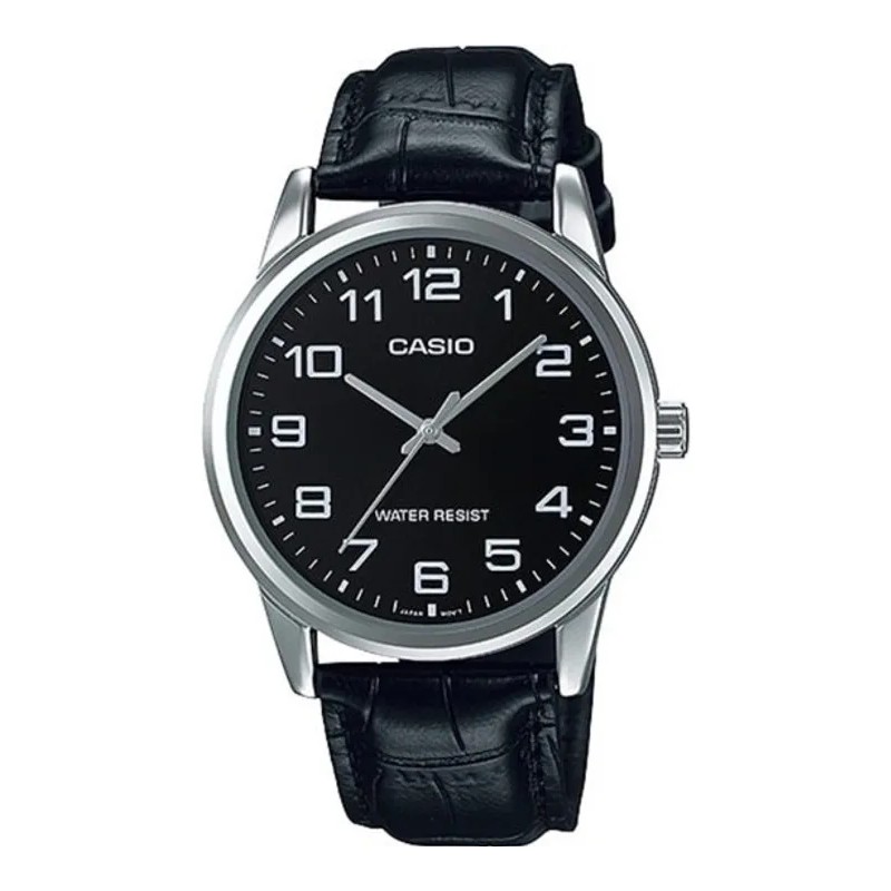 El Casio MTP-V001L-1B es un reloj análogo para hombre que combina un diseño clásico con funcionalidad moderna. Con su esfera negra, números blancos y correa de cuero negro, es el accesorio perfecto para el uso diario o eventos formales.