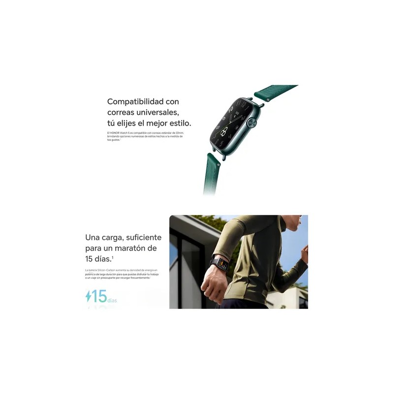 1. Los datos provienen del laboratorio HONOR, bajo la condición de uso con el teléfono Honor. Los resultados en aplicaciones reales pueden diferir debido al entorno, los hábitos de uso y otros factores. Escenarios de aplicación típicos: habilitar la medición continua de la frecuencia cardíaca (modo inteligente) y el sueño saludable, realizar llamadas Bluetooth durante 30 minutos por semana, reproducir música durante 30 minutos por semana, hacer ejercicio durante 90 minutos por semana (GPS activado), habilitar notificaciones (50 mensajes, 6 llamadas entrantes, 3 despertadores por día), iluminar la pantalla 200 veces al día. La duración real de la batería varía según los hábitos de uso de los usuarios.