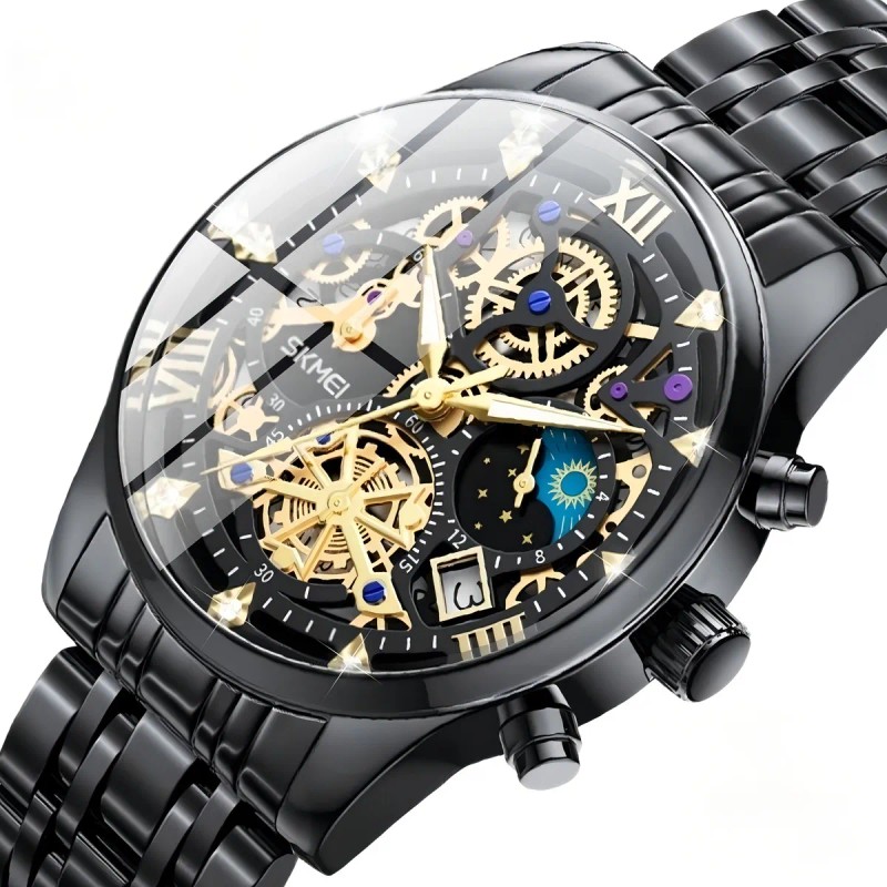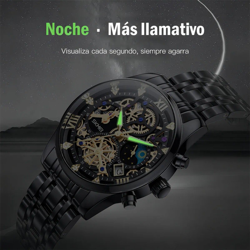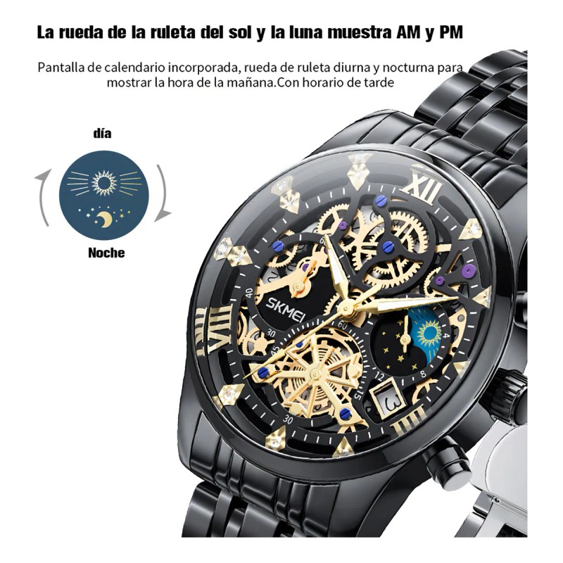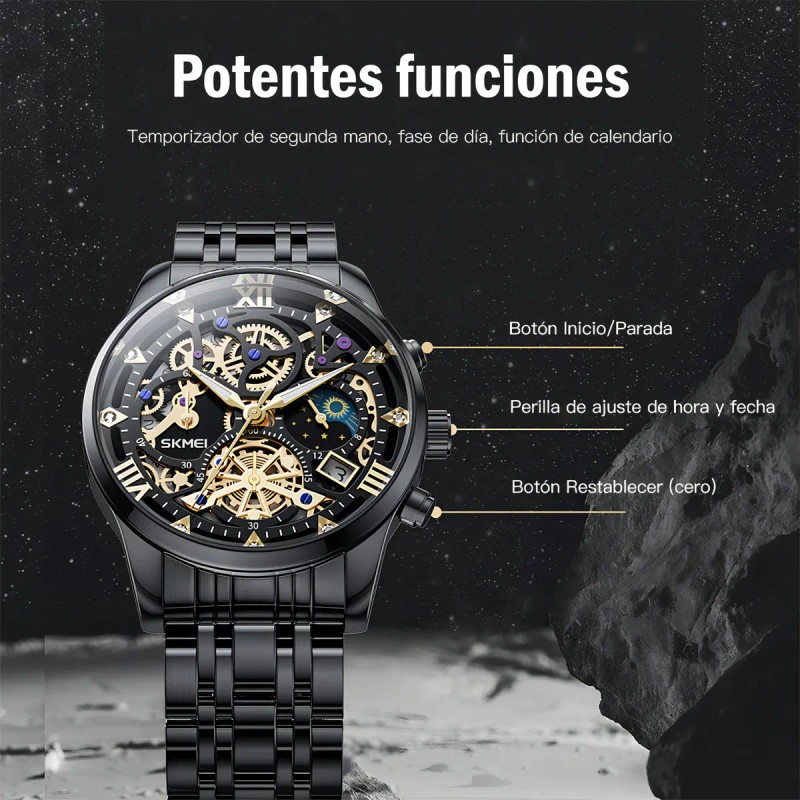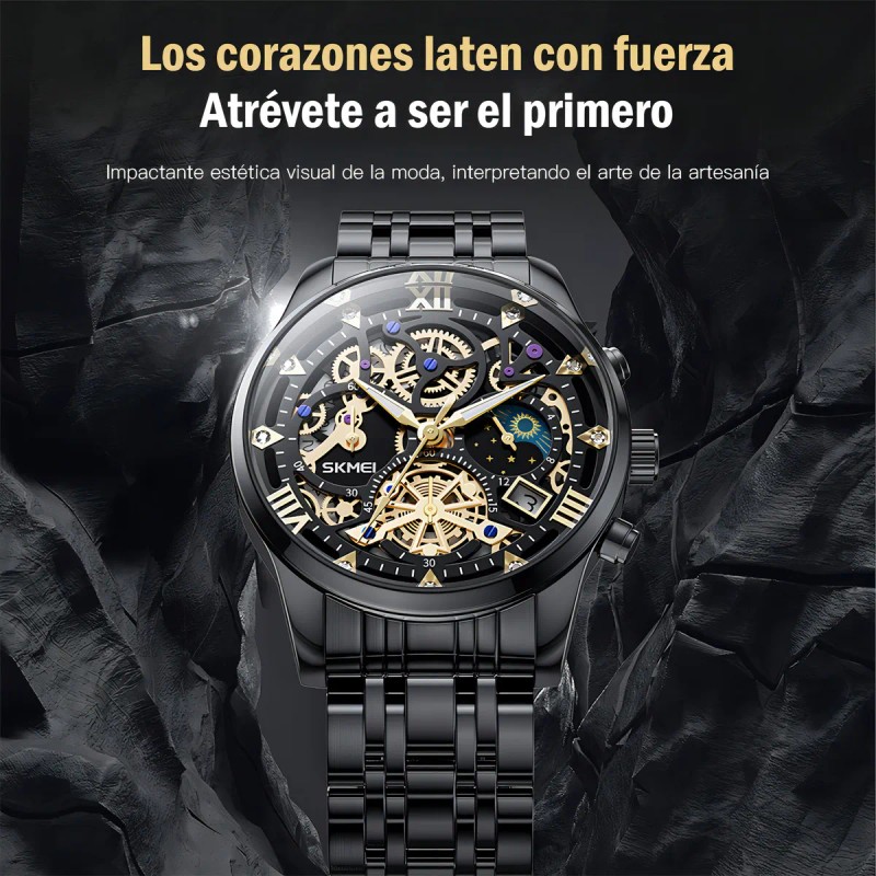 El Skmei 7039 destaca por su diseño elegante y características funcionales. Su caja de acero inoxidable en color negro y correa del mismo material ofrecen durabilidad y un aspecto moderno. Equipado con movimiento de cuarzo y funciones de calendario y cronógrafo, este reloj es perfecto para quienes buscan precisión y estilo.mercadolibre.com.mx