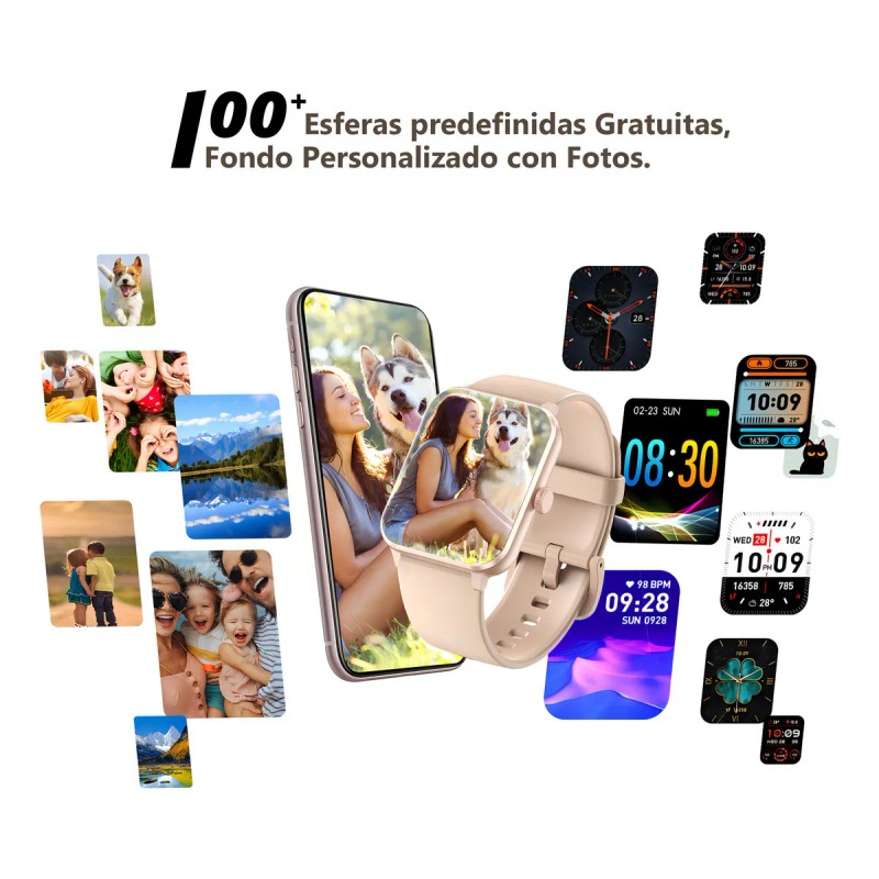 Su gran pantalla a color de 1.85 pulgadas está hecha de vidrio templado de alta calidad, lo que le brinda una excelente experiencia visual. Puede controlar el reloj deslizando el dedo hacia arriba, abajo, izquierda y derecha, o manteniendo presionada la pantalla. La aplicación viene con más de cien fondos de pantalla. Por supuesto, también puedes descargar tu foto favorita y configurarla como protector de pantalla de reloj, ¡solo levanta la muñeca para activar la pantalla fácilmente!
