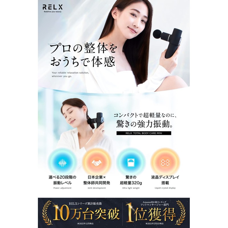 • (Supervised by Chief of Orthopedics) RELX TOTAL BODY CARE MINI allows you to experience authentic body care like professional body care in areas such as gym or golf, or when you are tired feet at the end of work, shoulder and neck. Ultra Lightweight Design: The main unit weighs only 11.8 oz (320 g), making it easy to use for all ages and young people. The shape makes it easy to grip even for women with small hands and is made of non-slip material