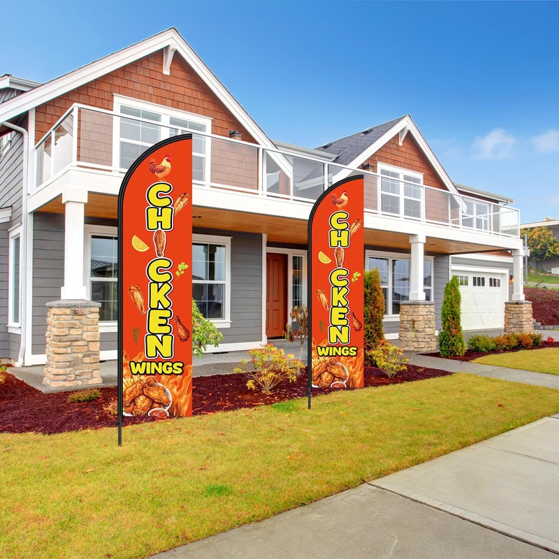 - All Inclusive Flag Kit: 2 vibrant chicken wings feather flags and 2 easy to assemble sectioned flagpoles with ground stake; Nice for setting up an attention grabbing chicken wings sign in no time