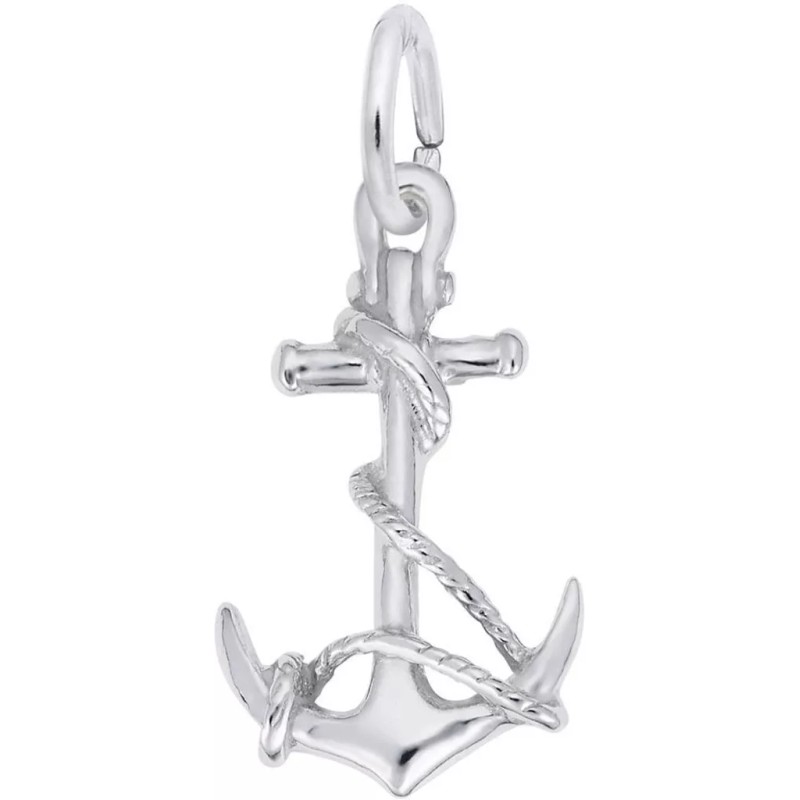 Anchor with rope charm by Rembrandt. Measures approximately 0.51 inches x 0.5 inches (13.02mm x 12.63mm). Genuine rhodium-plated sterling silver.This charm will not fit slide-on bead-style bracelets. HOWEVER, you can add a Rembrandt CharmDrop to make it fit.