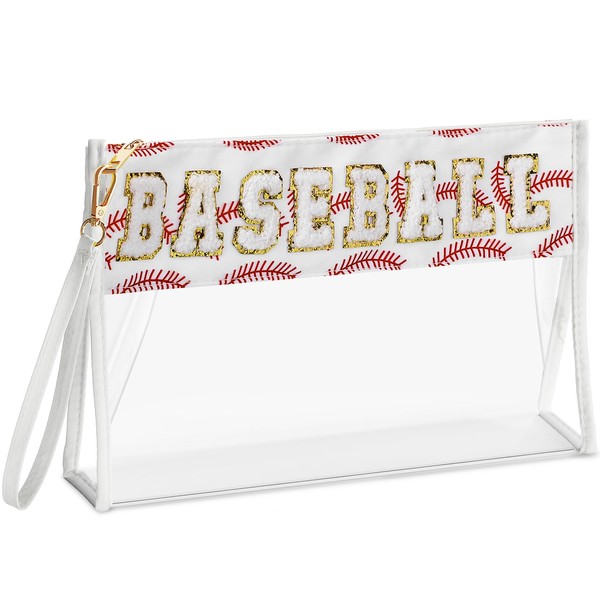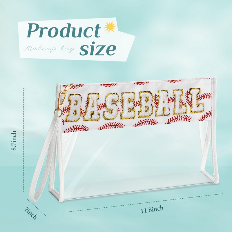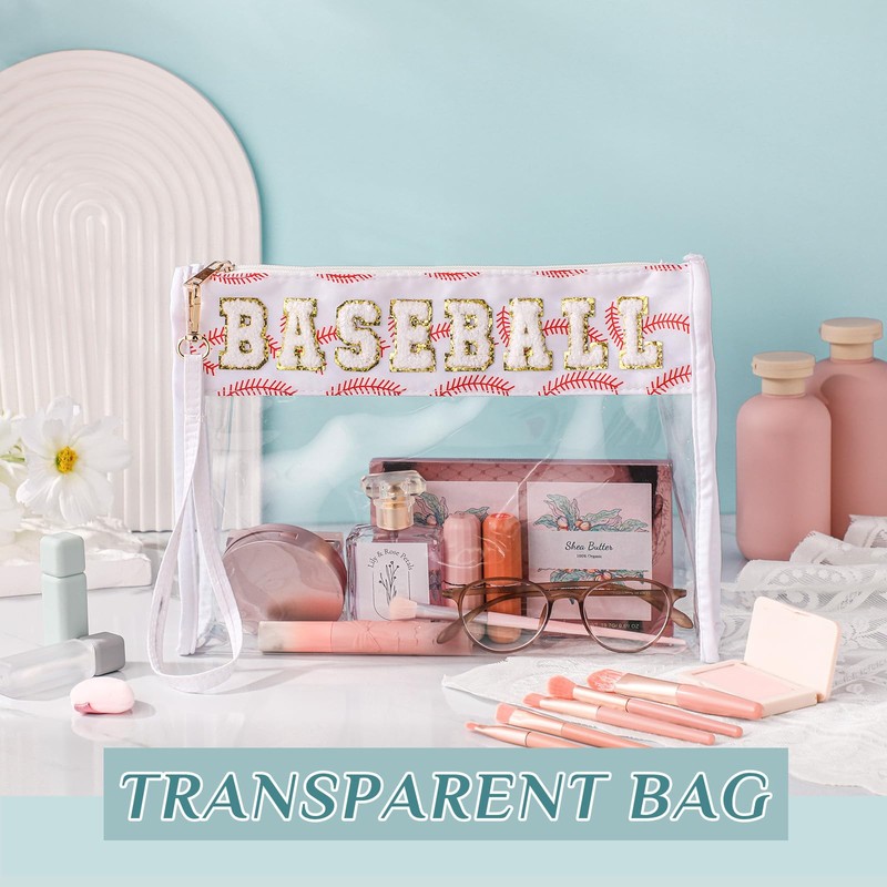 Remerry Clear Chenille Letter Makeup Bag Stand up Snack Bags Preppy Cosmetic Pouch Expandable Clear Travel with Wrist Strap Zipper Portable Multipurpose PVC Nylon for Women Travel(White,Baseball)