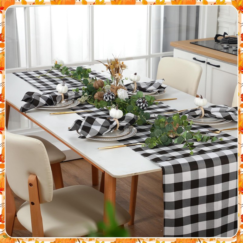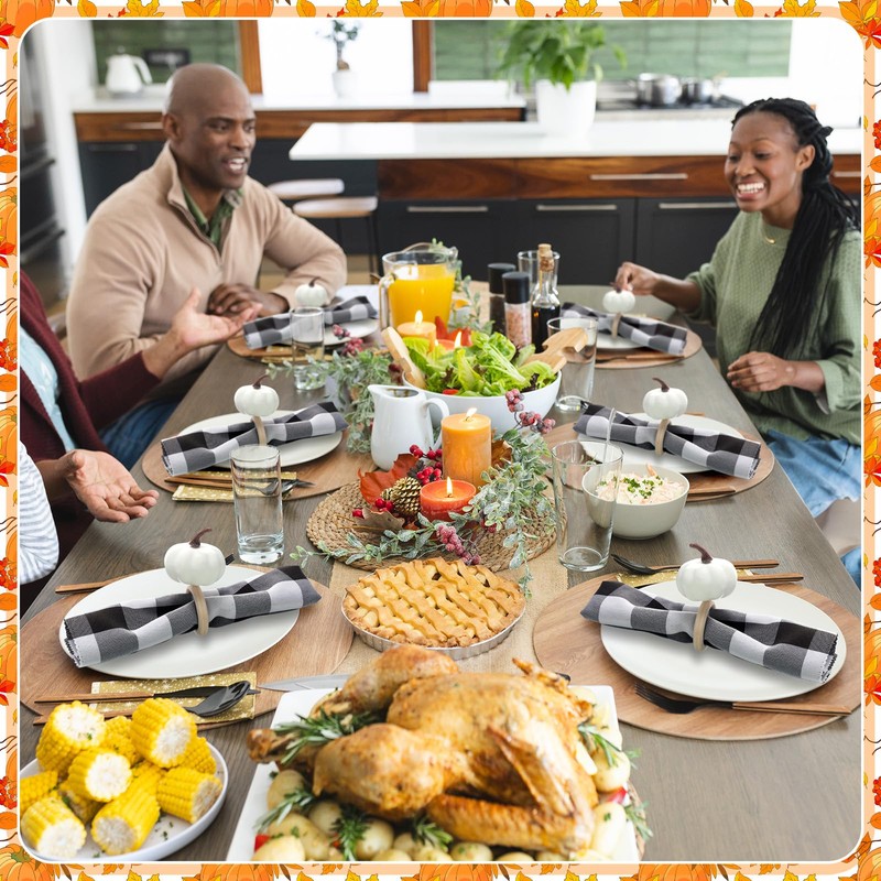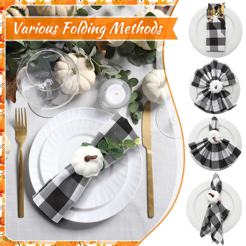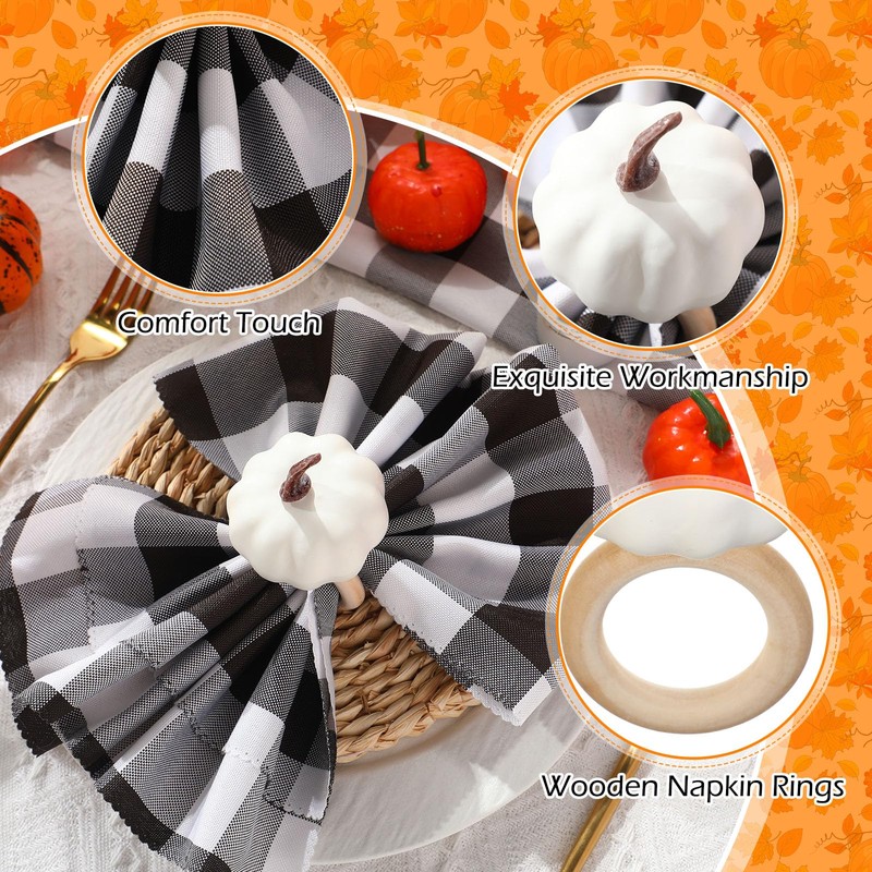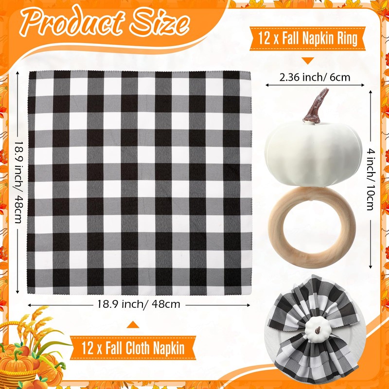 - Package Includes: you will get 12 pieces of white fall pumpkin napkin rings and 12 pieces of black and white plaid fall cloth napkins for Thanksgiving, each measuring about 18.9 x 18.9 inches, enough amount to meet your daily use and replacement demands, and you can also share with your friends and family, they will be the nice finishing touch to your dining table setting during the Thanksgiving, the simple elegant rustic harvest design will make your table look more attractive