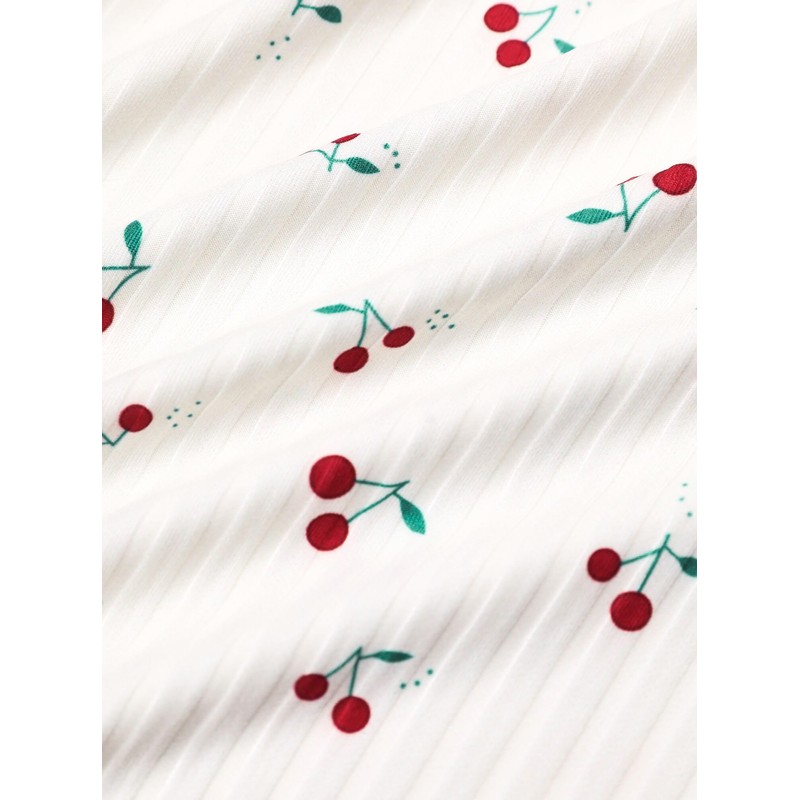 Remidoo Womens Cute Cherry Pajama Set Causal Lettuce Trim Split Hem Loungewear White X-Large