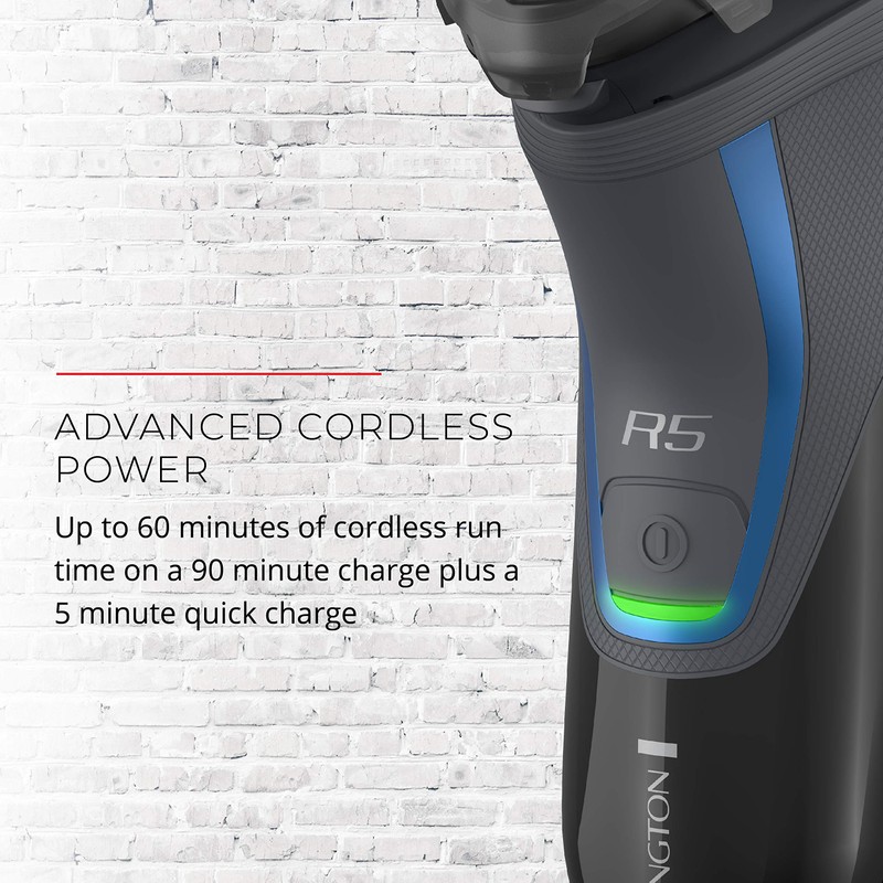 Add the power of titanium to your shave with the Remington R5000 series rotary Shaver. The titanium coated Twin track blades stay sharper longer to deliver durability and performance. That's 2x more tracks to ensure close skin contact for a fast shaving experience. The we Tech design gives you the freedom to shave dry or with gel, and in the shower. The precision plus heads capture long hairs and short stubble, and more contour^ keeps the heads in close contact on the neck and chin. You get two great styles from one shaver with the included stubble attachment. It snaps onto the shaver head and creates a stubble that will enhance your look. The special antimicrobial additive helps inhibit the growth of bacteria for a clean shave. The rechargeable battery delivers up to 60 minutes of cordless runtime with every full charge. Vs. Uncoated Remington Stainless Steel blades vs. Norelco series 1000 ^more than previous Remington model