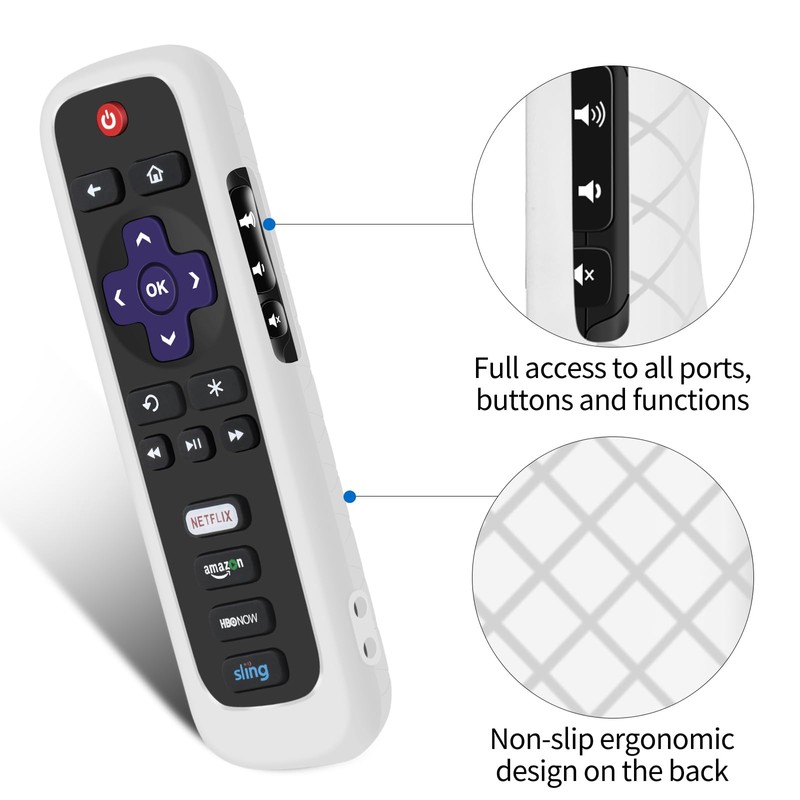 • Fits perfectly. Full access to all ports, buttons and functions, custom cutting on the case allows all functions of the remote are open for use. The remote battery cover Prevent the back cover and battery of the remote control for the Roku TV from being lost.