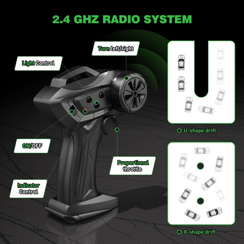- 2 Tire Configurations: Drift car comes with 4 speed racing tires and 4 drift tires. When you want to show off this rc drift car with stunts, you can use drift tires,with better handling and perfect agility, and when you want to make it a sports car, the racing tires will be your best choice