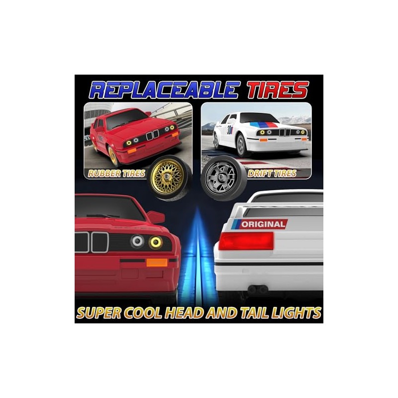 Dual Battery Long Life and Replaceable tires: The remote control drift car is equipped with two 7.4V 600mAh ultra-long life rechargeable batteries, each battery can provide you with nearly 60 minutes of racing fun, two batteries are fully charged, you will enjoy uninterrupted sports racing cars time! The remote control car is equipped with exquisite 4 racing tires and 4 drift tires, which have the most stable grip. You can also match the tires according to the racing venue and your own preferenc