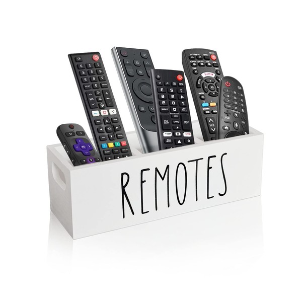 Remote Control Holder, Farmhouse Remote Storage Caddy, Bedside TV Controller Box, Rustic Wood Media Organizer Tray for Home Bedroom Table (White)