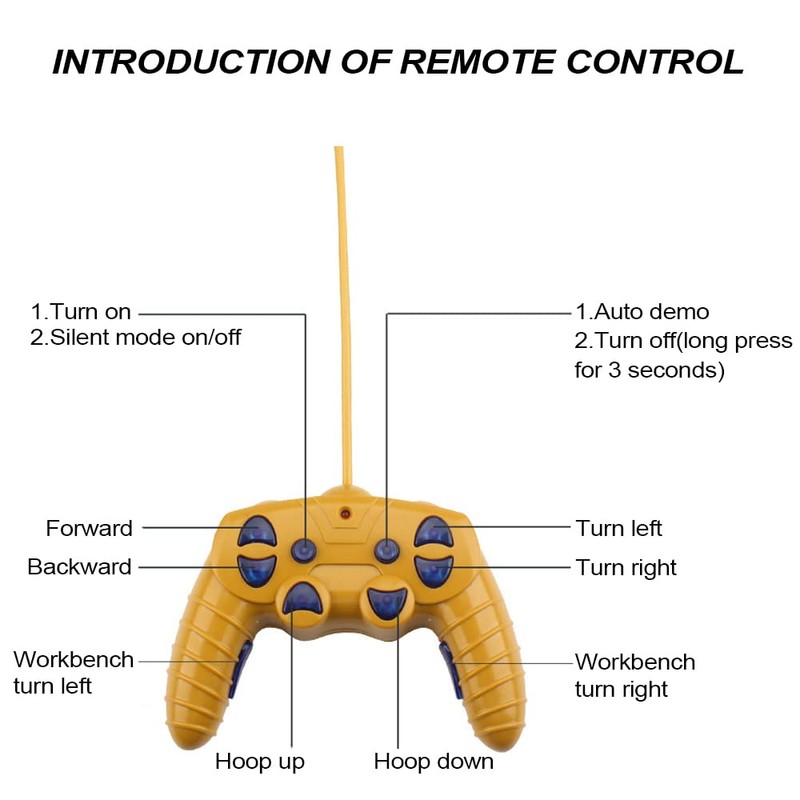 -- Go forward/backward, turn left/right, operating platform 360° rotation,arm(hook) rise/fall, sound control, demo function