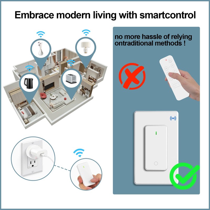 - ✅ Wall-Mounted and Portable Design】The compact remote control outlet includes a wall-mounted base and a lightweight detachable remote. Mount the base on the wall with the included tape or screws, or carry the portable remote for easy access. Perfect for families with young children, individuals with mobility challenges, or anyone seeking a convenient home setup.