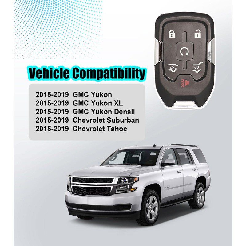 - Compatibility——Work with Various Vehicles -Key replacement kit is designed to fit for 2015-2019 Chevy Suburban Tahoe and GCM Yukon XL Denali. Before you purchase, please check details for car maker, model and year and the original FCC: HYQ1AA