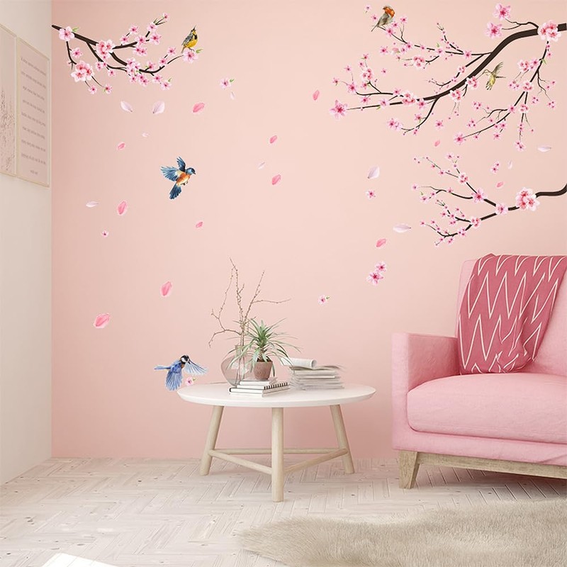 - 🌸UNIQUE DESIGN: Pink flowers wall sticker, peach blossom cherry blossom tree branch wall sticker, five birds flying next to the flowers, scattered flowers floating in the wind, a good picture of nature. This wall sticker is suitable for any design. The combined scene of flowers and trees will beautify the wall and create a vivid and wonderful picture for your room. You will be very satisfied when it is finished!
