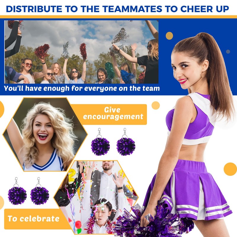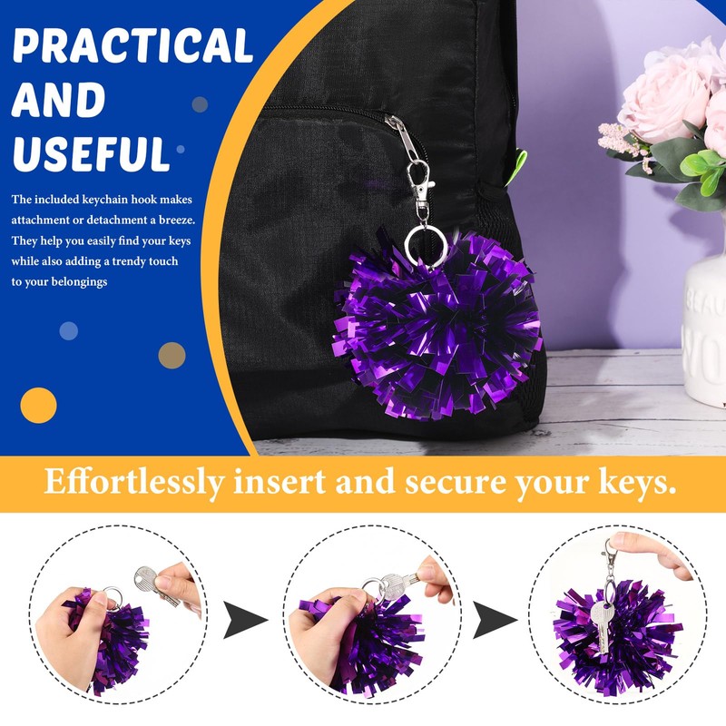 - Sturdy Material and Vibrant Colors: these pom pom keychains are made of quality plastic and metal for durability, and feature nonfading, shimmering purple foil; They catch the eye, boost cheerleading spirit, and show your strong support for the team