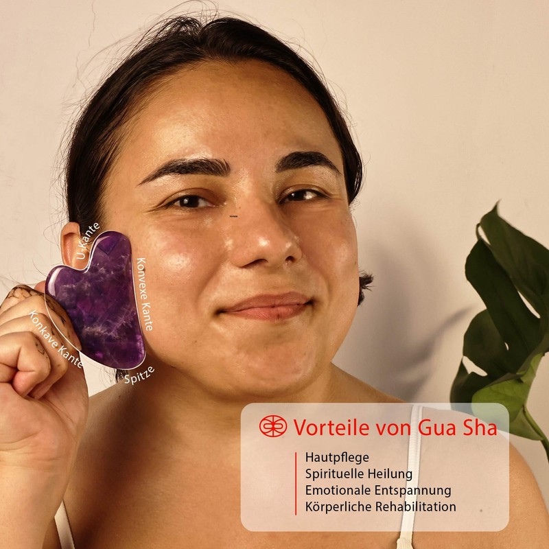 • NATÜRLICHER STEIN: Der Gua Sha Stein von Rena Chris wird in Handarbeit aus 100% Amethyst aus Brasilien hergestellt. Amethyst symbolisiert Harmonie, Liebe und Entspannung. Er kann Ihnen dabei helfen, Ihre positiven und negativen Emotionen auszugleichen und die Entspannung und Selbstfindung zu fördern.