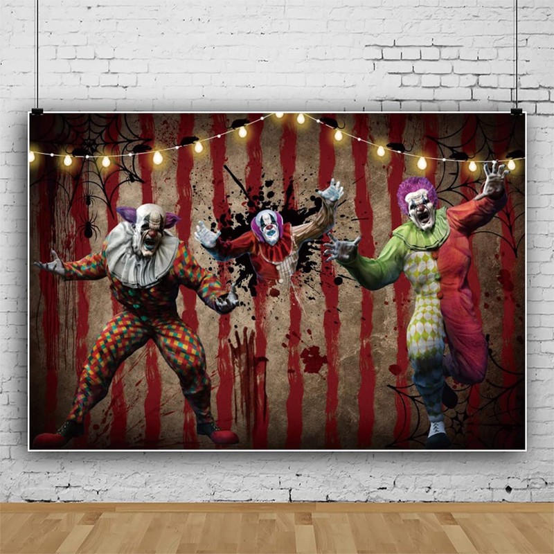 Renaiss 10x7ft Halloween Evil Clown Backdrop Horror Circus Scary Carnival Halloween Background Blood Handprint Spiderweb Trunk or Treat Birthday Party Decors Clown Circus Halloween Photo Booth Props