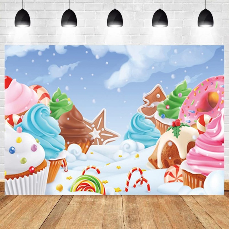 Renaiss 5x3ft Winter Candyland Backdrop Cartoon Sweet Dessert Ice Cream Cupcakes Donut Lollipop Snow Photography Background Kids Baby Shower Candy Theme Birthday Party Decor Photo Studio Props