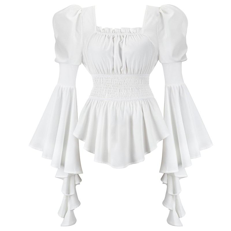 - Style: This medieval blouse is square neck design and decorate with lace ruffle,Long bell sleeves, Elastic high smocked waist, Elastic elbow design.