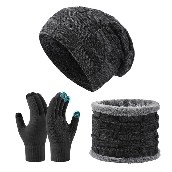 RENDIN Gorros Invierno Bufanda - Guantes Tactiles con Tejido de Punto 3 en 1 - Bufandas con Forro de Felpa para Mujeres y Hombres (Negro)