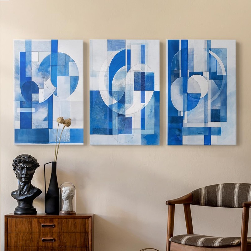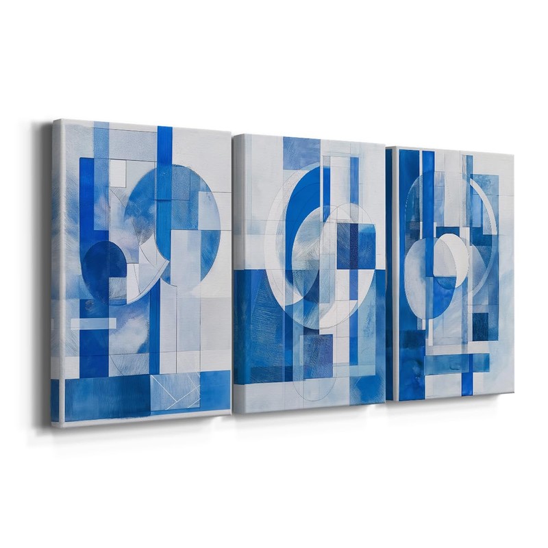 Renditions Gallery Art for Room Decor Abstract Blue & White Geometrical Illusion Modern Canvas Paintings for Kitchen Lounge Office - 12"x18"x3panels GAL055
