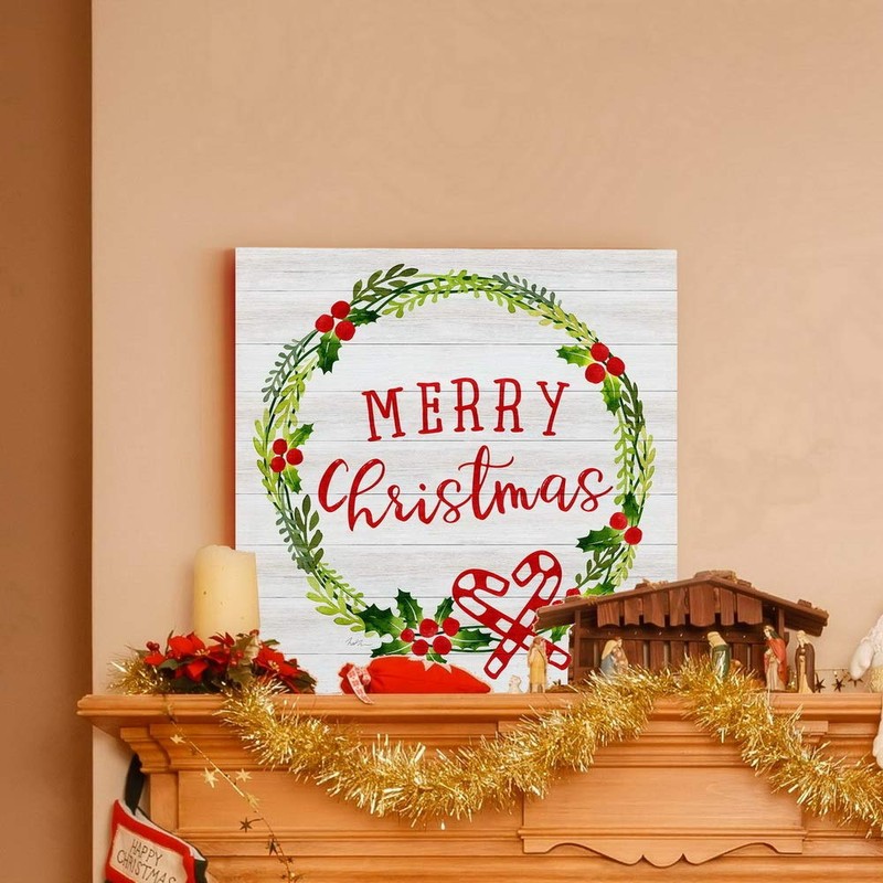 Renditions Gallery Merry Christmas Wreath Wall Art, Cute Christmas & Winter Artwork, Red & Green Word Art, Premium Gallery Wrapped Canvas Decor, Ready to Hang, 16 in H x 16 in W, Made in America
