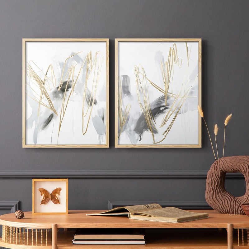 Renditions Gallery Set of 2 Peel & Stick Framed Prints, Abstract Wall Art, Gold & Gray Swirls Wall Decor, Re-Stickable - Ready to Hang - 8"x10" - Natural Frame LT608