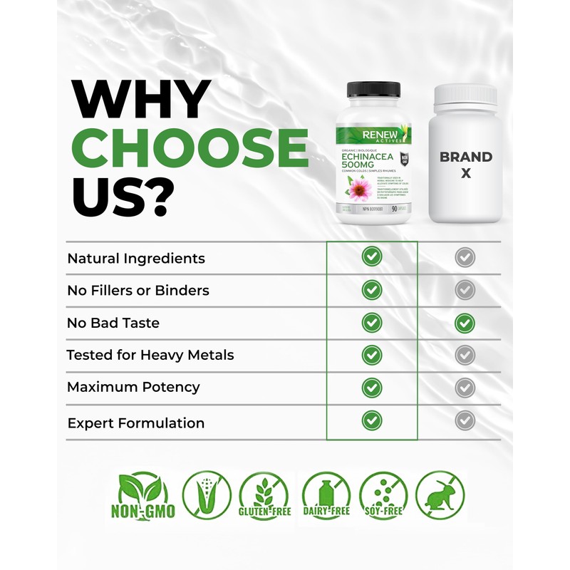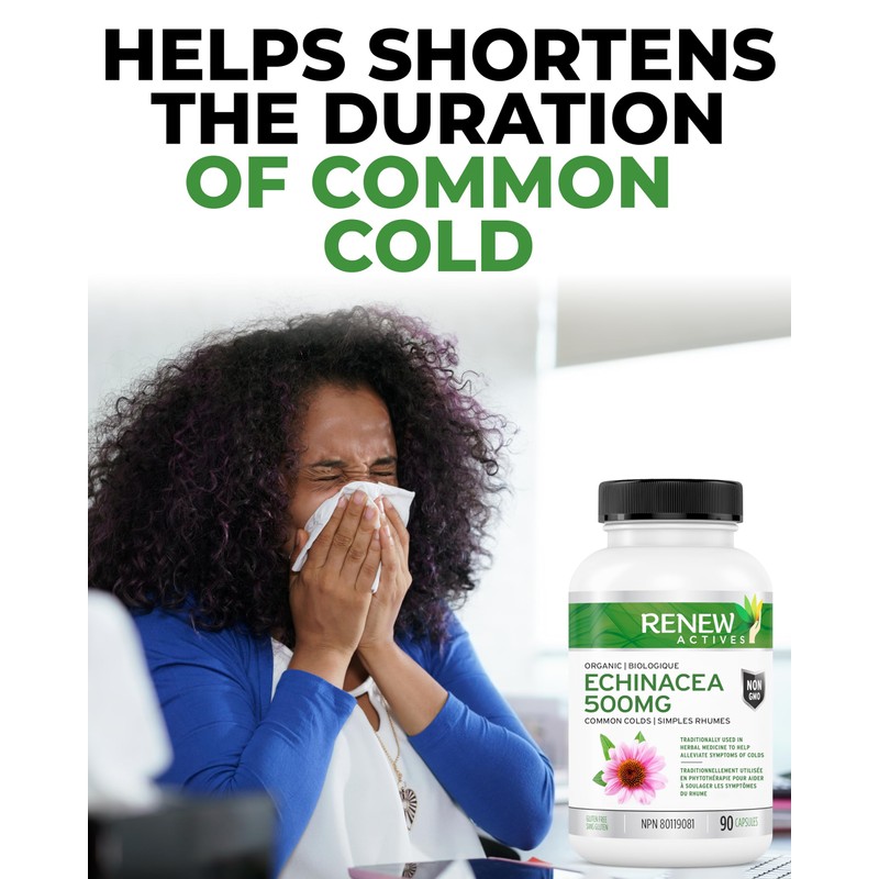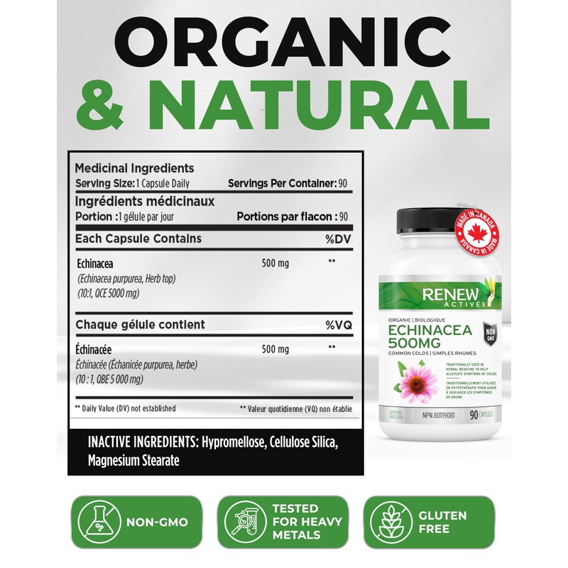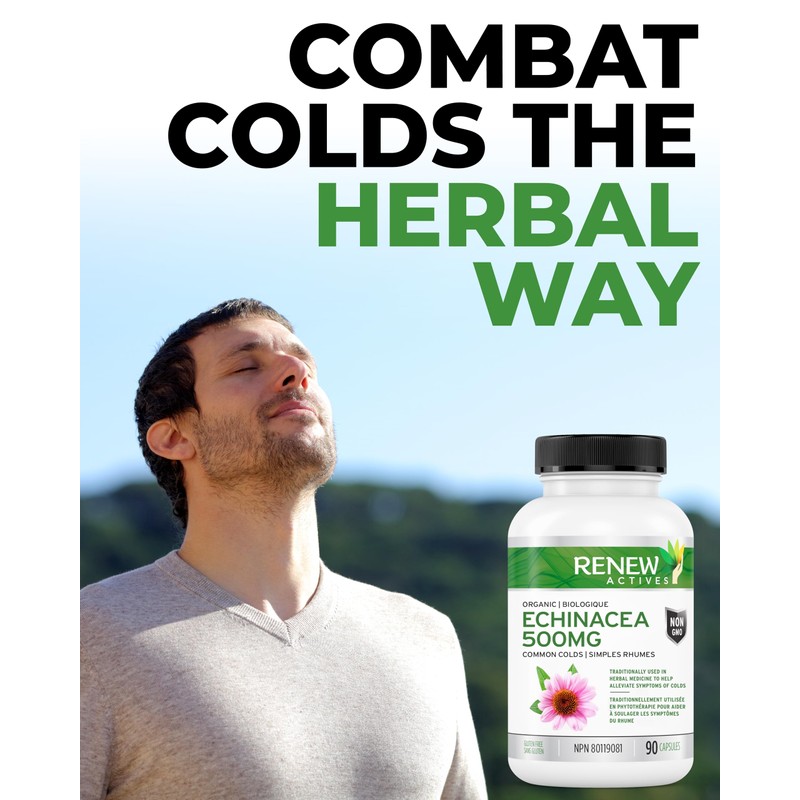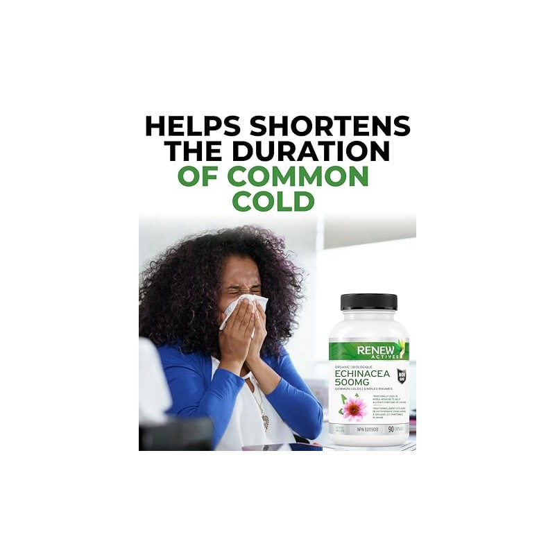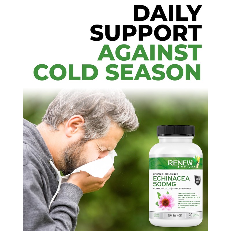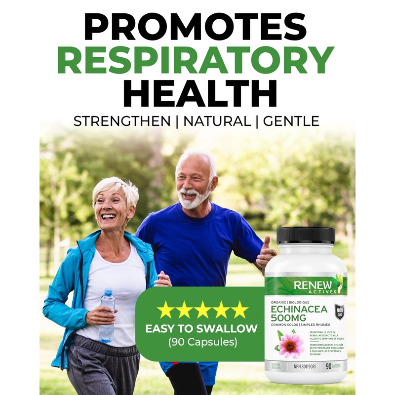 Renew Actives RENEW ACTIVES ORGANIC ECHINACEA 500MG per Serving - High-Potency Herbal Supplement for Respiratory Health, Non-GMO, Easy-to-Swallow - Helps Relieve Cold Symptoms - Made in Canada - 90 Veggie Capsules