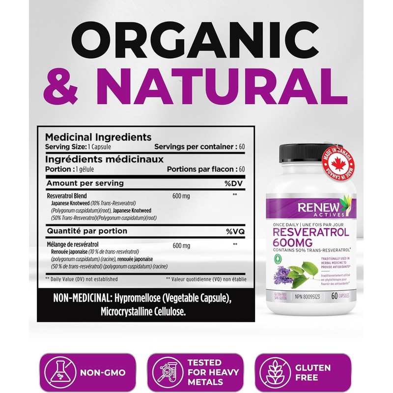- Trans Resveratrol Power: Enjoy the antioxidant benefits, featuring 50% Trans Resveratrol. This potent formula helps reduce oxidative stress and promotes overall wellness, providing high antioxidant protection for long-term vitality. NPN: 80095123