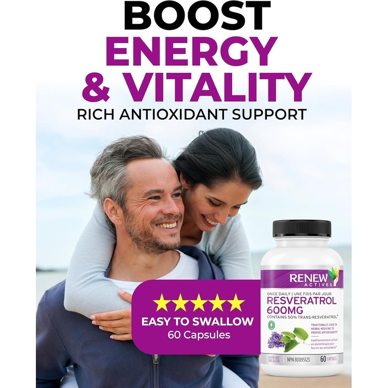 Renew Actives RENEW ACTIVES Resveratrol Supplement 600mg per Serving - High-Potency Antioxidant Complex with 50% Trans-Resveratrol C Supports Cellular Health & Longevity - Made in Canada C 60 Vegan Capsules (2pk)