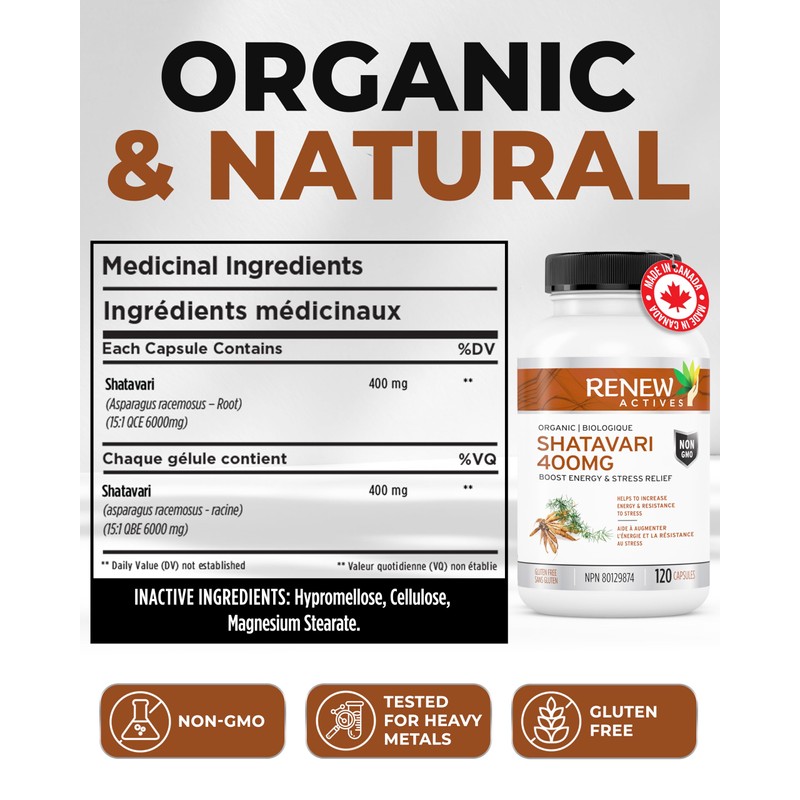 Renew Actives RENEW ACTIVES Shatavari 400MG per ServingC Natural Adaptogen for Energy, Vitality & Endurance C Promotes Wellness & Resilience with Ayurvedic Herbs C Organic, Vegan C Made in Canada C 120 Capsules