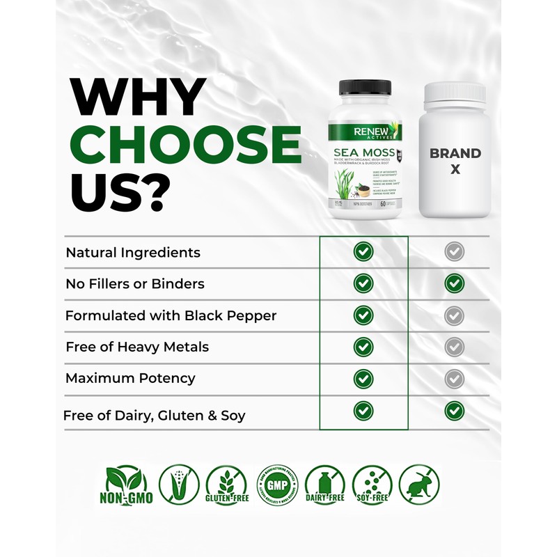 - POWERFUL ANTIOXIDANT: Renew Actives Sea Moss Capsules harness the rich antioxidant properties of Irish moss, providing your body with a natural defense. Fortify your cells, combat free radicals, and promote overall well-being with this potent source of antioxidants.
