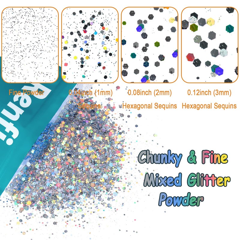 - ✅Sealed Bag Packaging - 3.5Oz (100g) Silver chunky glitter mix with super fine glitter powders mixed chunky glitters, and the bag is sealed with a sealing strip, so that the remaining handmade powder is better to stored. It's also more space-saving to carry.