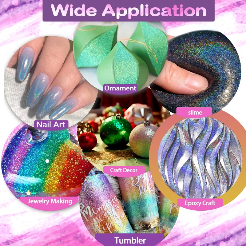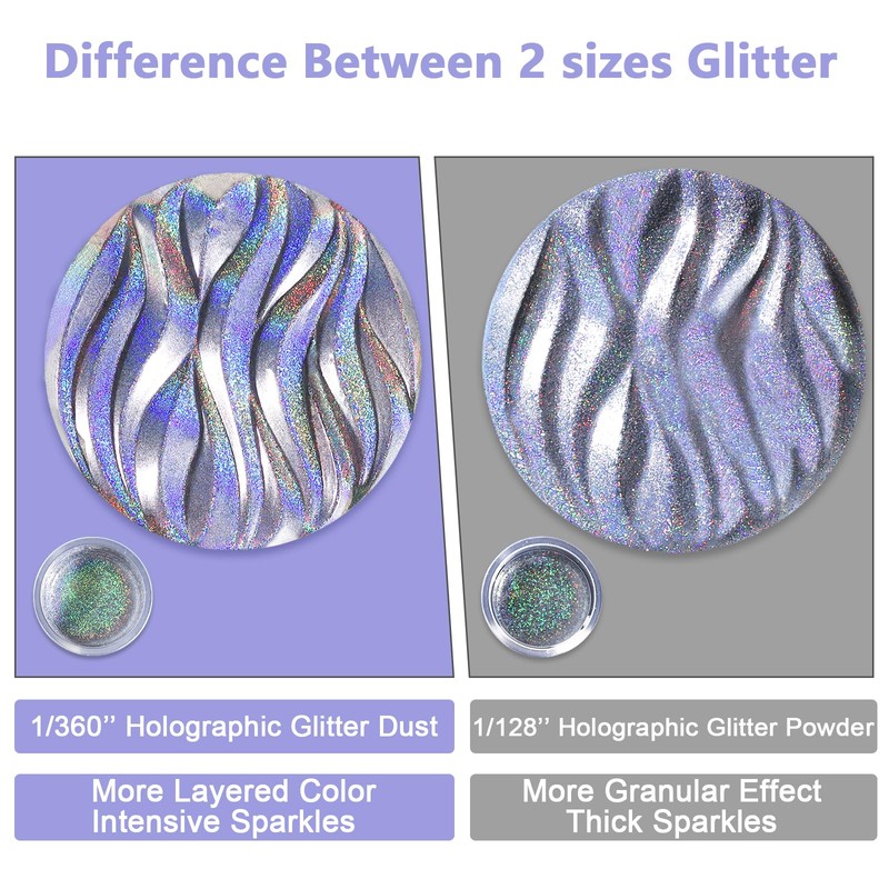 - ✅ Finest Resin Glitter - The partial size of holographic glitter for crafts is 1/360" (0.08mm) like dust, the finest size you can find, which make glitter easy to mix with resin and won’t appear lumps or sink in resin. Great ultra fine glitter adds a hue and sparkle to the resin.