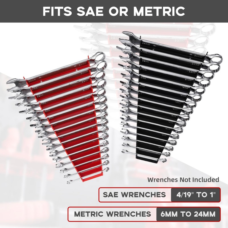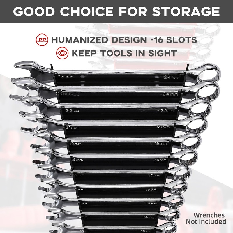 - Upgraded Design: Professional tool wrench holder features 16 slots. Fits both SAE & metric wrenches, and holds wrenches from 4/19" to 1" and 6 mm to 24 mm. The enlarged version is very friendly to the crowd with a large number of tools.The enlarged design has played a significant role in storage.