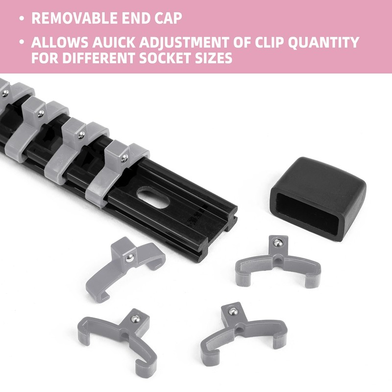 - Convenient to Use: Removable end cap, easy to add or remove clips. Each clip features spring-loaded ball bearings that firmly hold the sockets in place, making it easy to find the right socket when you need it.