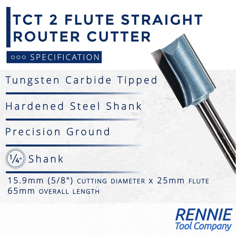 Rennie Tool Company Rennie Tools - 15.9mm (5/8") Cutting Diameter x 25mm Flute x 1/4" Shank TCT Tipped 2 Flute Straight Router Cutter Bit. Compatible With Makita Bosch Trend Katsu Dewalt Router Etc. 5/8 Router Bit