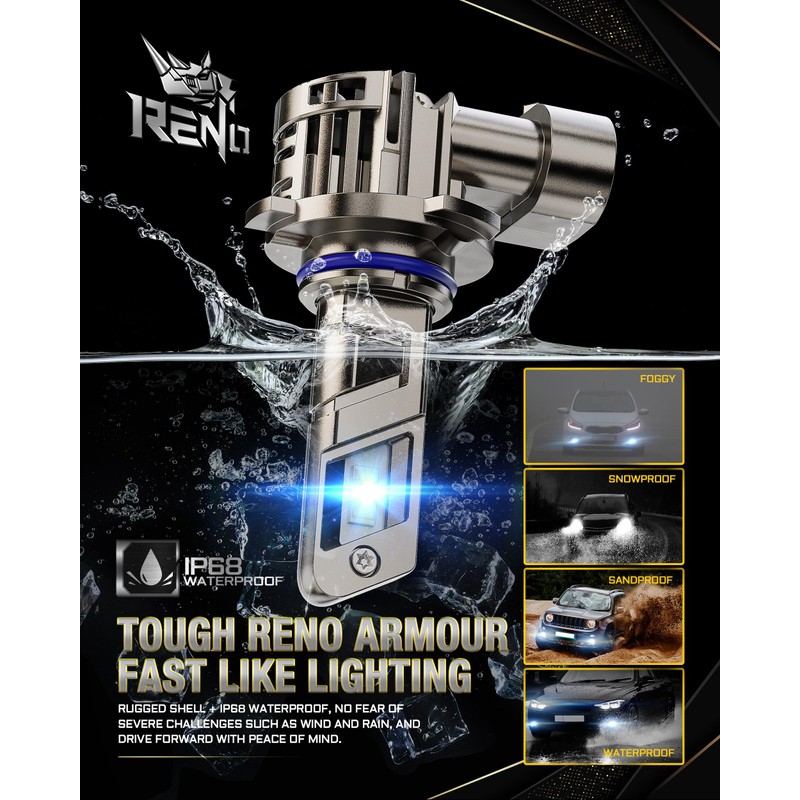 - 9012 Better Driving Experience: RENO 9012 HIR2 bulbs have wider vision than OEM bulbs, and focus beam pattern illuminates reveal road signs, Driving safer in a variety of weather,rainy, foggy, snowy, and off-road.