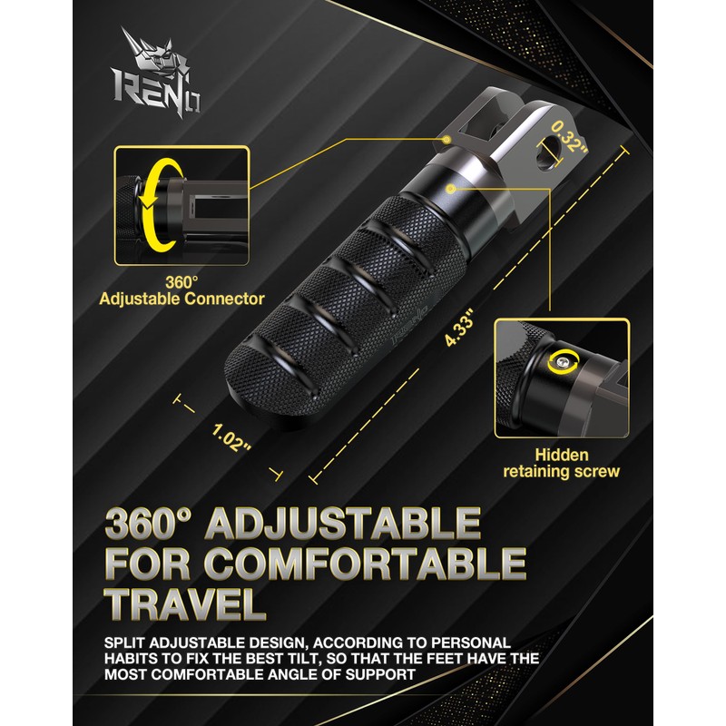 - 【CNC Precision Machined】RENO motorcycle footpegs made of 7075 aluminum alloy. CNC process has great tensile strength, sturdy and durable, not easy to break. Black anodized surface, rich in texture and rust and corrosion resistant.