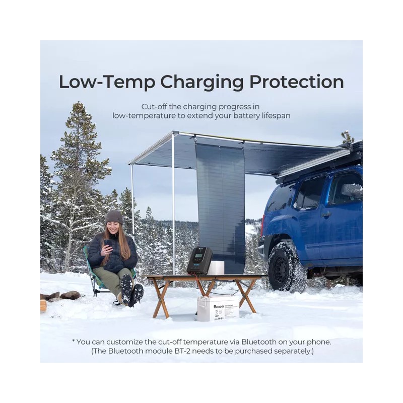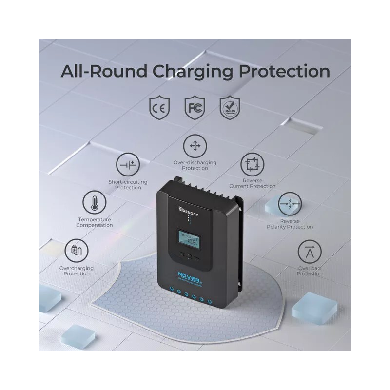 The Renogy Rover 20A Solar Charge Controlle features 8 electronic protections to actively monitor changes of voltage, current, and load for efficient and safe battery charging.