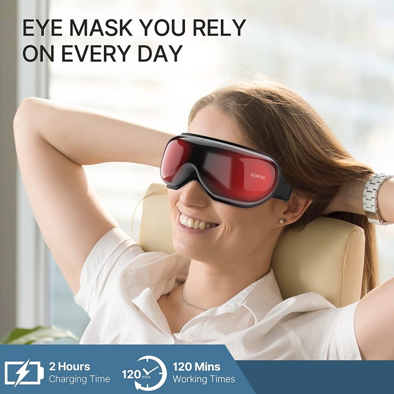 - Reduce Eye Strain & Improve Sleeping - RENPHO eye massager adopts oscillating pressure and rhythmic percussion massaging, it can make the skin around the eyes more shiny and elastic. RENPHO heated eye mask with Bluetooth music can play a good sedative effect. Wear it for 15 minutes before going to bed every night, you will be totally relaxed and enjoy a better sweet dream. Our eye care machine also can effectively help you be refreshed after long-day work or study.