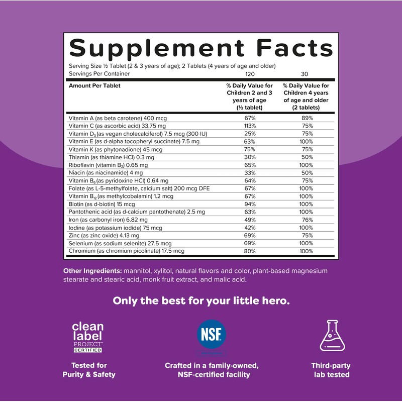 - How to take: Children 2-3 years old take 1/2 tablet daily; children ages 4 and older take 2 tablets daily; our vitamins melt in your kids’ mouth or can also be dissolved in water, juice or even smoothies. Kids can chew them or let them melt without worrying of anything getting left behind on their teeth.