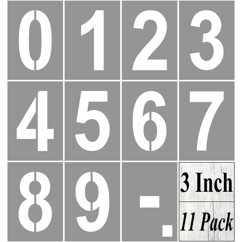 The Advantages of Our 3 Inch Number Stencils: Unique Designs & Classic Style Complete Set of Numbers Easy to Use & Removed Tear Resistant & Washable Reusable, Easy to Clean & Store Quality Eco Friendly PET Materials Laser Cut, No Sharp Edge, Safe for Children Premium Quality, Not Easy to Get out of Shape Wide Range of Applications, Suitable for Most Flat Surface Cut from Durable & Flexible 10 Mil Mylar Sheets, Smooth SurfaceWidely Used:This number stencil templates set is made of durable and flexible PET material,it has smooth surface allowing you to apply them on most flat surface.They are great for wood signs, wall signs, cakes, cookies, scrapbooking, advertising, packaging, party decorations and more.Make Artistic Creation Easy & Fun:These stencils can save you a lot of time when creating crafts,you can customize numbers to create any art projects you want.You just need to put them on flat objects, paint with a brush or spray with a spray gun, simply do it!Important Tips:Any smooth and clean area is suitable for stencil painting.The rougher the surface, the harder it is to get clean, clear lines while painting.Use a brush or spray gun to get the best stencil art.What You Will Get:* 11 x Number Stencil (4 x 2.7 inch)
