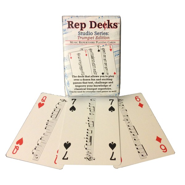 Rep Decks are musical repertoire playing cards that allows you to play over a dozen fun and exciting games that test, challenge and improve your knowledge of classical trumpet excerpts. A melodic excerpt from the standard trumpet audition repertoire appears in the center of each card. All excerpts are shown at their CONCERT PITCH. This 54-card deck includes all 13 ranks in their customary suits plus red and black joker cards. The traditional one-eyed face cards have an "eyeball" image on them to remind players which ones they are. Play everyday card games and then download the free Studio Series Games Manual and Answer Key to begin using your wits and knowledge of trumpet repertoire to play clever Rep Decks games like Rep Recall, Team Rep Recall Relay, Rep Recall Challenge, Team Rep Recon, Rep One Eye on the Conductor, Rep Audition Roundabout and many more! Or use as flash cards, study aids or a randomizing tool for audition preparation. The Games Manual and Answer Key are not included with the deck of cards but are free to view, download and print at anytime. The tuck box that the cards are packaged in will be tight when it is new and first unwrapped but after a few uses the box will loosen up and be easy to open. Rep Deck games were play-tested by the fine trumpet players of the Terry Everson Trumpet Studio at Boston University.