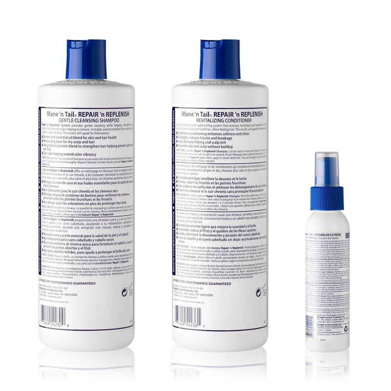 SHAMPOO: Repair ’n Replenish System provides gentle cleaning while helping strengthen and nourish the hair and scalp, helping restore, revitalize and recondition for a more natural healthier, silkier feeling. The results will speak for themselves! CONDITIONER: A Gentle cleaning and replenishing system that restores, revitalizes, and reconditions for a naturally clean scalp and healthier, silkier feeling hair. The results will speak for themselves! For Curly and Natural Hair. DETANGLER: Mane ’n Tail Detangler Extreme is the solution to tame hard to comb hair, plus curl defining to tighten, smooth and define curly hair. Our exclusive pH balanced formula is easy to use and helps eliminate tangles and the appearance of dry, split ends while adding additional conditioning benefits. Your hair becomes easily manageable with a rich and luxurious shine.