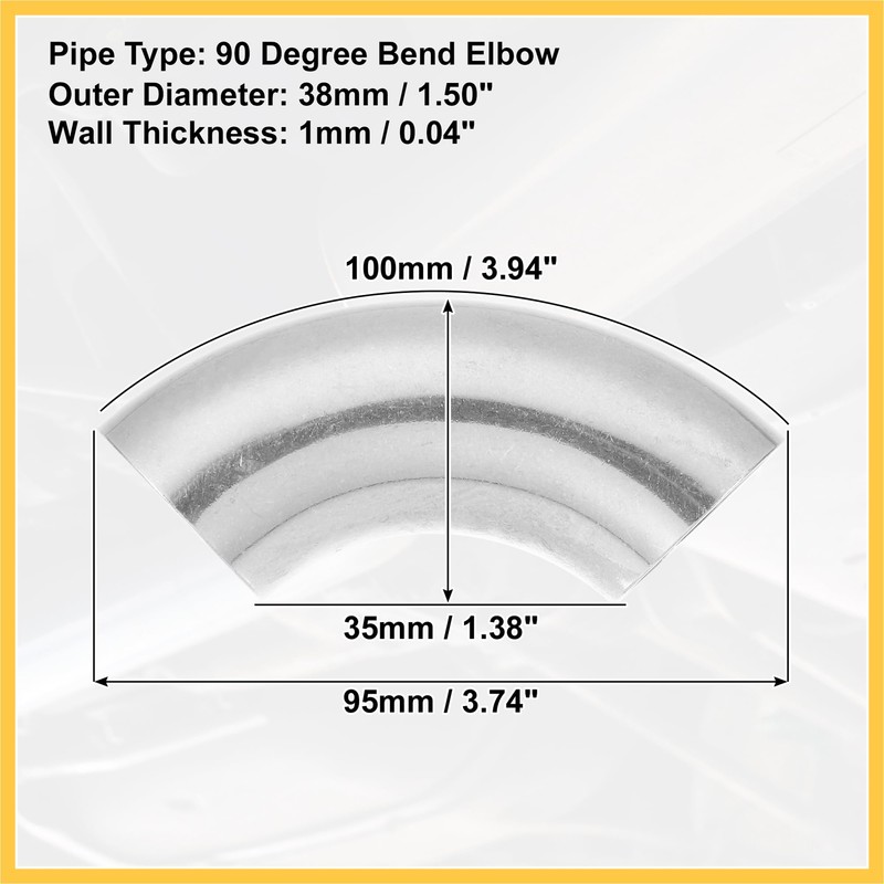 - Fitting: Pipe Specification: Pipe Type: 90 Degree Bend Elbow. Size: 95x40mm / 3.74"x1.57"(L*W); Outer Diameter: 38mm / 1.50"; Back Arc Length: 100mm / 3.94"; Wall Thickness: 1mm / 0.04".