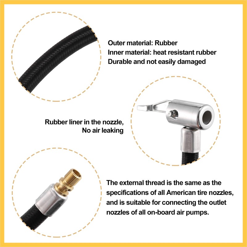 - Benefit: Made of good material, corrosion resistant, wear resistant, good performance, durable and flexible. The tire air inflator hose adapter is made of durable stainless steel and a heat resistant rubber hose, durable and not easily damaged.