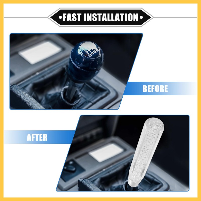 • Useful: EASY INSTALLATION - 1. Remove the existing gear shift head; 2. Select and install the correct adapter; 3. Install the new gear knob on the adapter, then install it on the knob rod. 4. Tighten the screws, done.