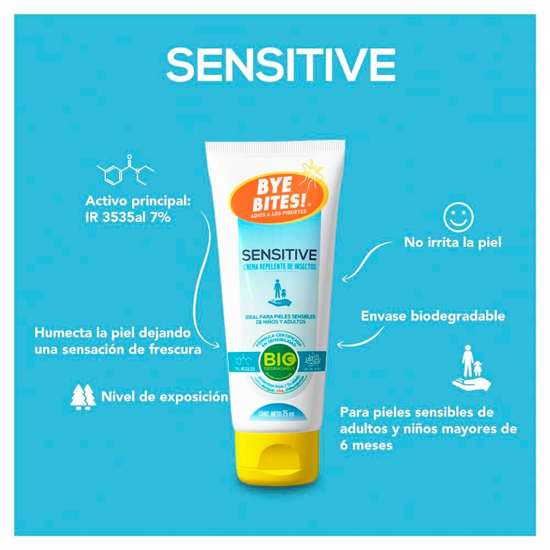 Repelente de Insectos y Mosquitos Crema Sensitive Bye Bites con Aloe Vera, Para Pieles Sensibles y Niños, 75 ml